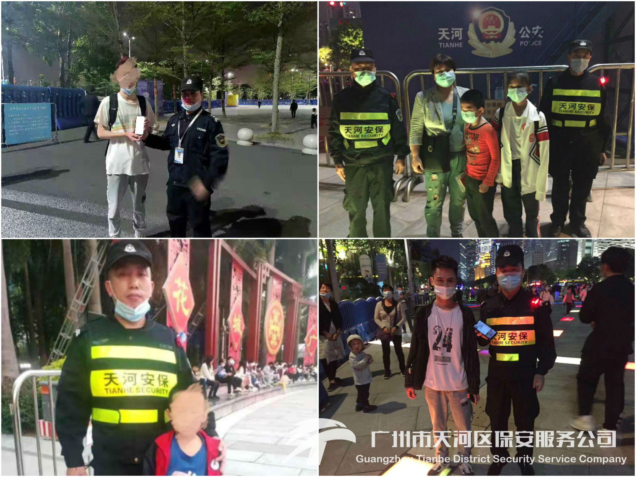 11月28日,我司保安员张劲生在中区消防广场执勤时,发现一名走丢儿童,经上报后带到喷泉广场等待家长认领,经过确认证实后,儿童回到家长身边;我司保安员向家国和周建军在花城广场南广场巡逻时发现一小孩与家人走失,他们及时报给现场民警,通过了解及联系后,家长领回小孩,家长对我司安保人员表示感谢!