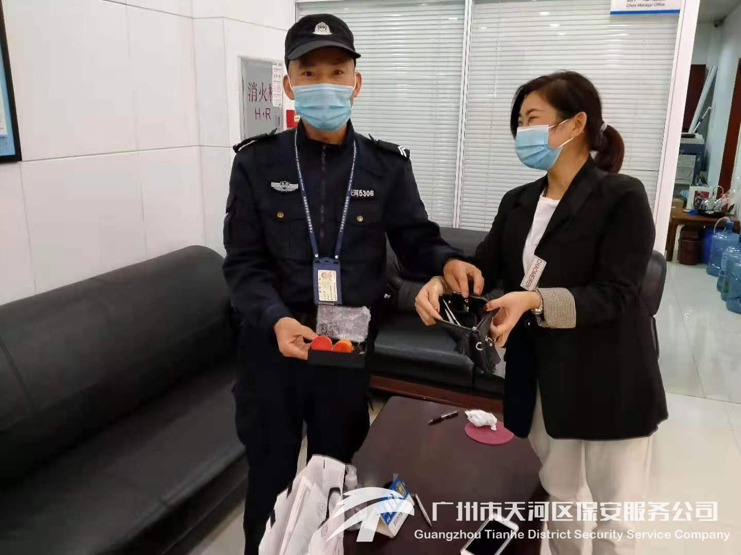 11月20日,我司保安员陈志泽在猎德大桥路段岗位执勤时,捡到华为手机一部,在失主打电话过来确认沟通后,将手机交还给失主。