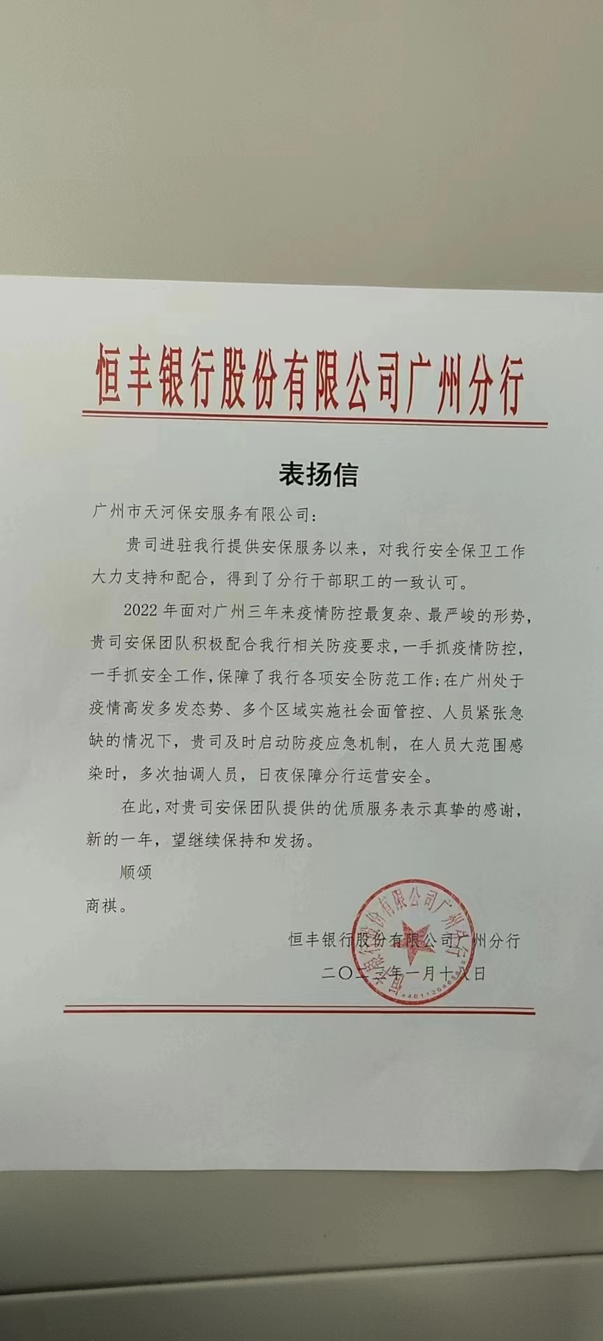 1月18日,天河保安公司收到客户单位——恒丰银行广州分行的一封表扬信,肯定和表扬公司派驻到该行的保安队伍在2022年度银行安保工作和疫情防控工作中的履职尽责、尽心尽力、坚守奉献,赢得了银行领导和工作人员的赞誉。