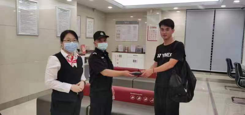 4月24日,公司派驻工商银行南国支行保安员聂伟明在执勤巡查时,在客户休息区座位上捡到钱包一个,内有现金若干和相关证件,当即交给网点负责人,并协助联系客户。客户见到钱包失而复得,对工商银行和公司的优质服务深表赞许,对聂伟明同志拾金不昧的品质深表感谢。